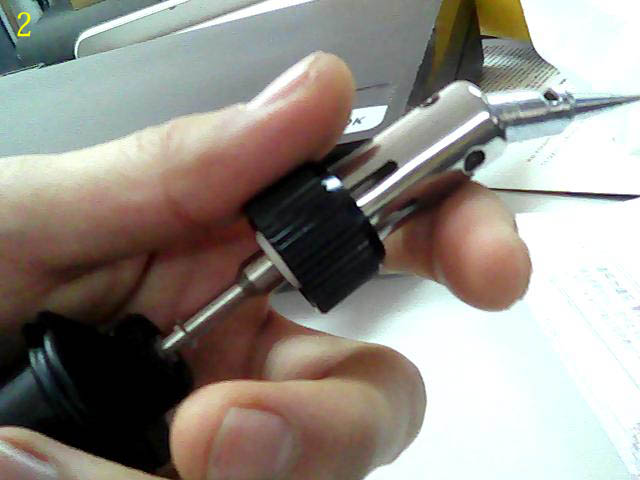 在PRO-100.PRO-110.PRO-120.PRO-150.PRO-180产品包装中会附加一个配件镍片座(铜),也可以叫做陶瓷座。 这个配件是烙铁内部气体流经的部件之一,在烙铁出现出气不畅,堵塞情况下,可尝试更换这个配件。以下是方法: 首先拧下烙铁尖端组件 漏出镍片座(铜) 取下镍片座(铜) 注意陶瓷口朝上,把新的镍片座(铜)换上,反操作安装上就可以了。 如果堵塞问题仍旧没有解决,请联系我们协助解决,建议您使用纯净气体